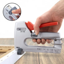 All-metal, bottom-loading magazine fires 85 type 140 (6-14mm) staples, 100 type 91 (6-14mm) staples, 90 type 18G (10-15mm) nails, or 90 type 180/15mm pins. 3-year warranty when using Tacwise staples and nails.